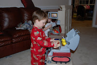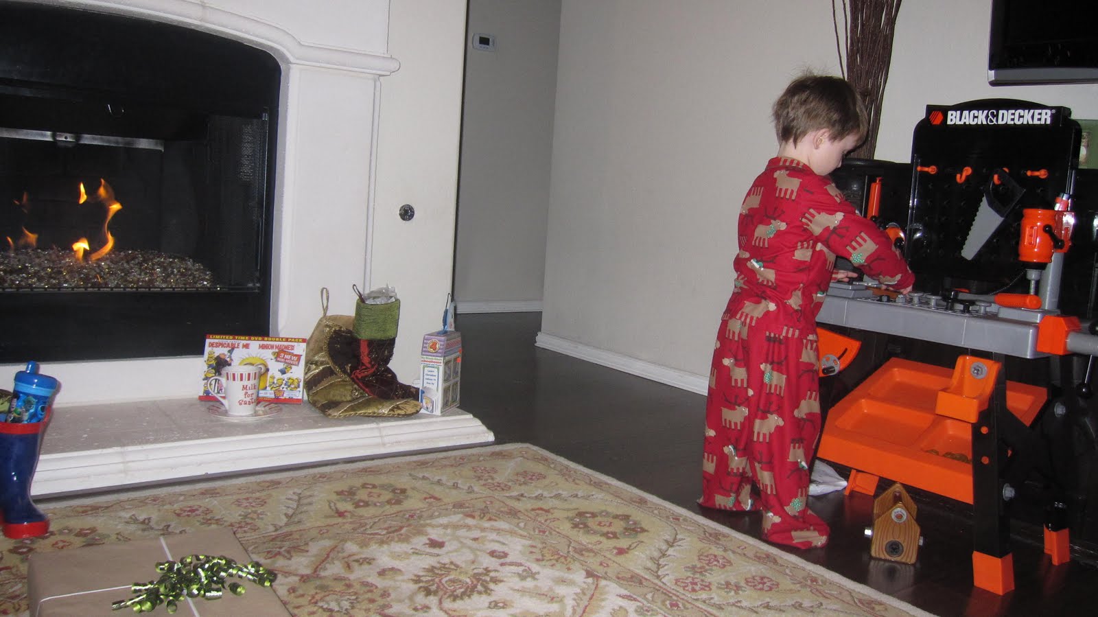 I'm very well aware that I will forever remember that exact moment. The way his flannel reindeer jammies hung on his body and the intent look on his face as he woke up that morning and made a beeline to his little tree in the playroom and then turned with the saddest look ever and said, "Mommy, Santa didn't come." "Yes he did, baby.....he put your present on the fireplace.....see?" I guess with all the talk about Santa and explaining that he brings one very special toy to good little girls and boys on Christmas Eve while you're sleeping and that he needs cookies and milk to get him through the night because he travels all over the world in such a short time frame......we forgot to mention that he comes down the chimney.