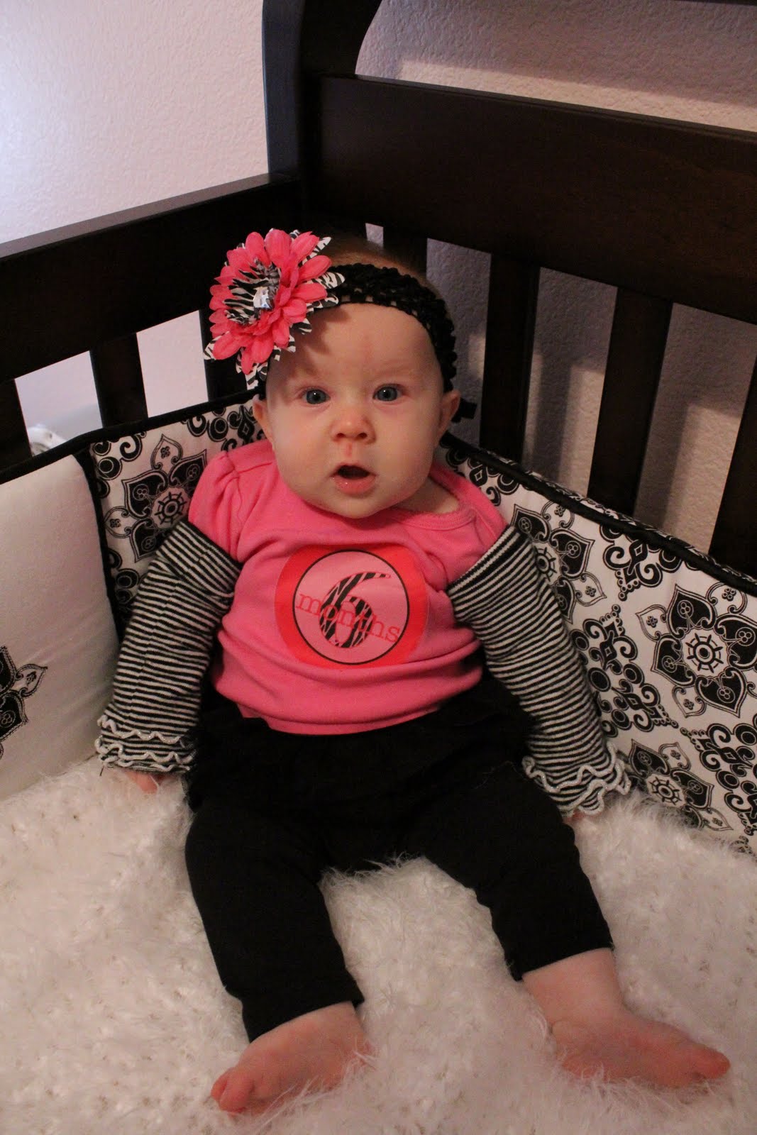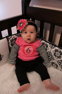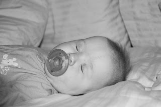 You are nursing about 6 times a day and are sleeping from 8-midnight and then midnight to 7 a.m. All we have to do is make sure you are dry and that your tummy is full and then walk you into your room, lay you on your tummy with a sassy and your blankie and say, "Night Night" and you're out! Just.Like.That.