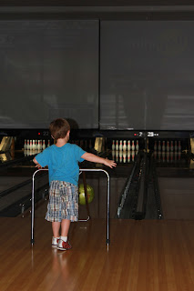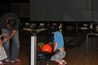 We eyeballed another preschooler with her family using some sort of miraculous bowling contraption that seemed to move the ball down the lane a tad bit quicker than snail speed.....